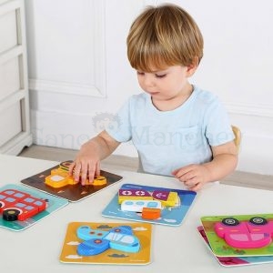 A beginner-level toy to determine shapes and fit of objects. It develops fine motor skills, logic, attention, smart thinking and patience. Set includes: puzzle board, cargo truck, airplane, ambulance, bus, fire engine, tow truck and a car.