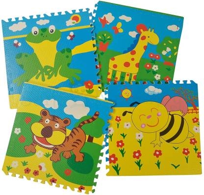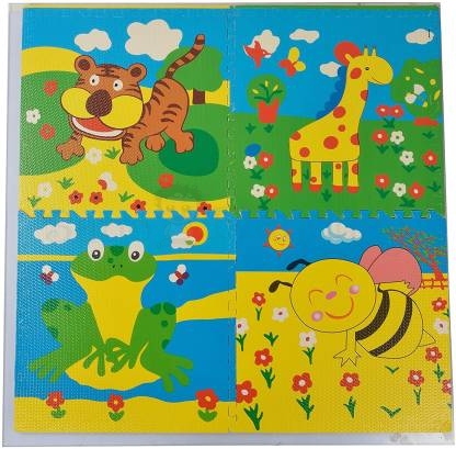 4 piece tile set with a printed animals. It’s a way more interactive experience than traditional plain mats. Large Play Surface Each tile measures 24 inches wide by 24 inches long and when all 4 tiles are connected the entire surface is nearly 4 ft. wide by 4 ft. long which is room enough for multiple small children to sit and play together.