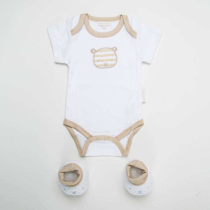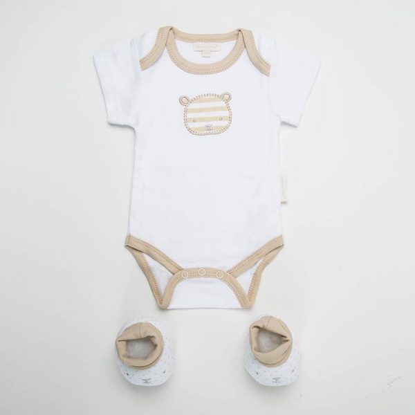 These cute yet elegant set of 2 pieces Layette consists of a short sleeve bodysuit and a pair of booties. The baby bodysuit included expandable envelope neckline for easy dress and snap closure buttons at the bottom for speedy diaper changes. A pair of booties to keep little toes warm and safety.